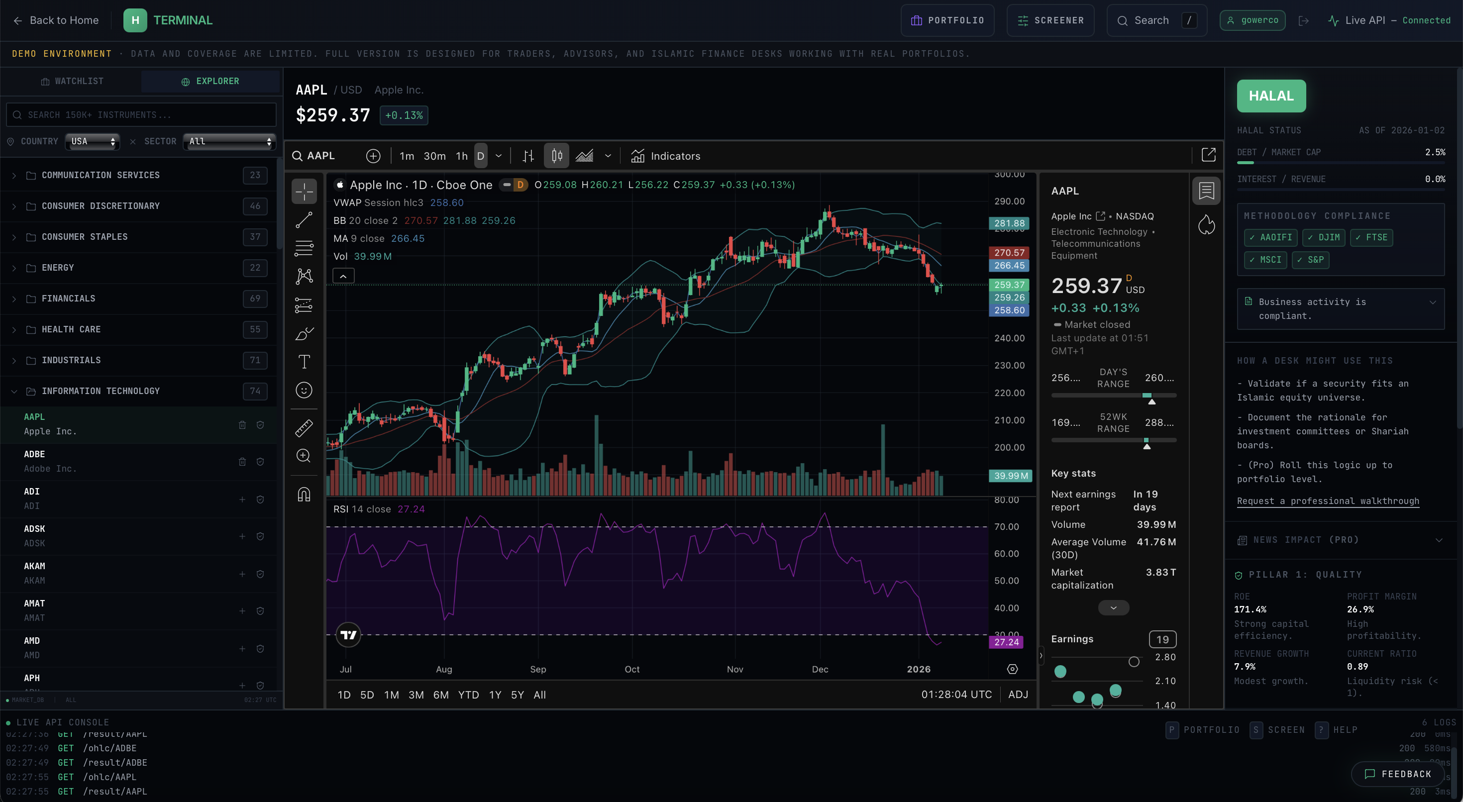 TradingView-grade charting + Halal overlay